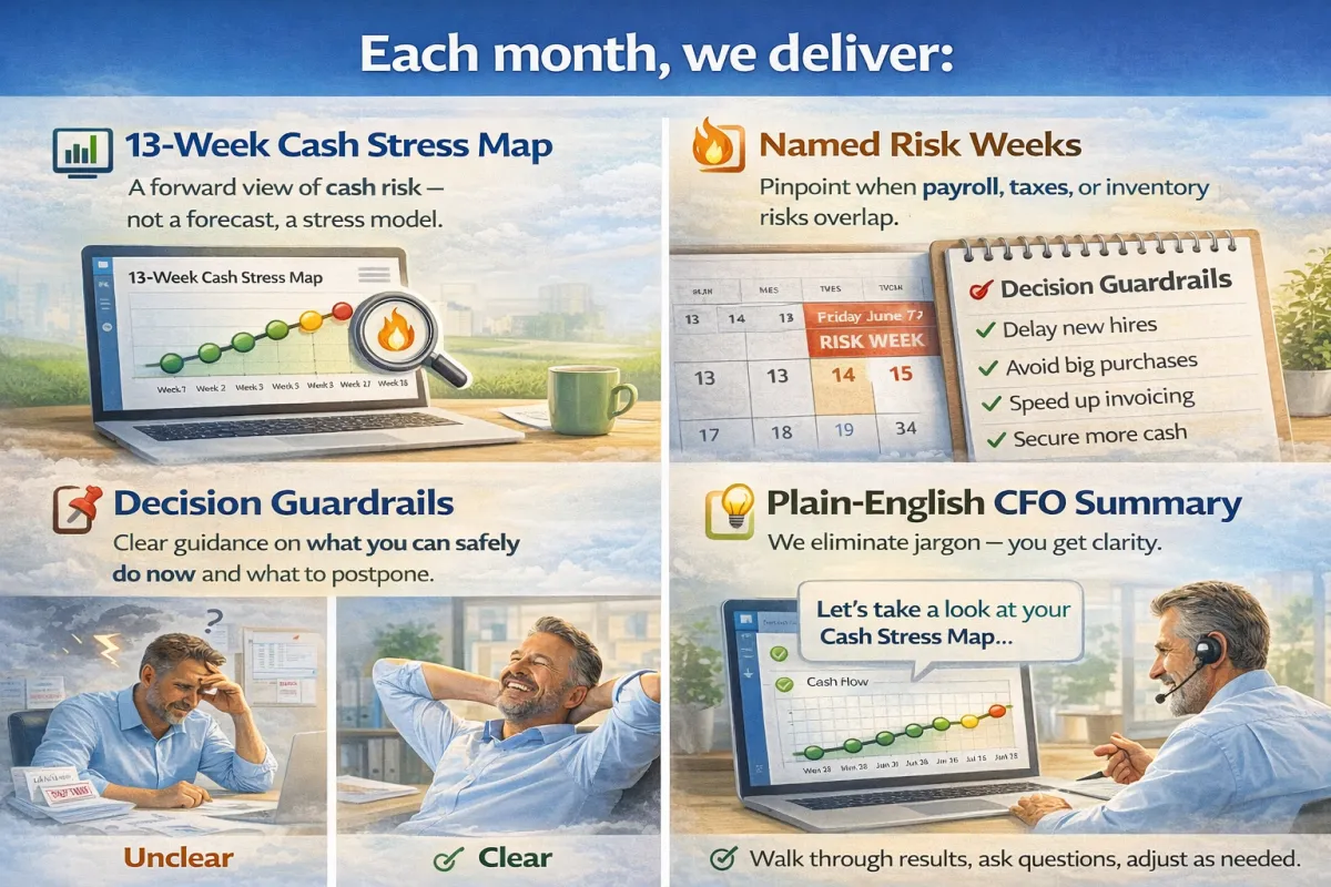 Most owners are “profitable” on paper but still stressed about payroll, taxes, inventory, and debt timing.